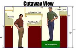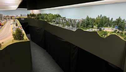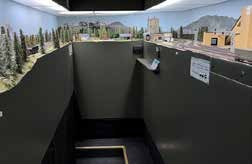 This layout is a mushroom design as a multi-level layout. This gives a single or double level along the perimeter walls with a double level peninsula down the center of the room. By utilizing careful track planning the aisles can vary to allow for extra room at congestion points like switching yards or large industry areas. As you can see in the cutaway view the high ceilings in the layout area are essential to provide for the varying track height. This approach allows for the design to plan for people first and not track. The idea is to direct people to the action on the layout, create a comfortable space, guide visitors, and get them caught up in the action. John was out on the construction site each day during the construction process to assure that his plan was followed. The mushroom design was completed using L- girder construction with 48” and 56” track heights. A 16” raised floor was constructed for the higher track areas. To help define working space at the layout, mats were placed on the floor to define the working area. Curved corners are used to facilitate movement, and alcoves were developed where people need to stand for a while. Electrical circuits are grouped on a wall to keep all power at a common point. The curvilinear nature of the track plan was to create a feeling of isolation keeping the operators in the scene and gives a perception of longer trains and length in the distance. The layout makes use of “negative space” or the spaces between places. This is where the scene is simply scenery and track without any work areas. The operator needs to keep moving though with the train. Wayfinding is facilitated by fascia mounted panels and signage.