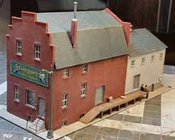 The adjacent building was a symmetrical structure modified for this application. The side wall was replaced with Monster Model Works cut stone. The smokestack was added, the doors replaced, and the movable crane added to the front of the building.