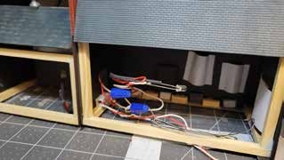 Jerri Arnold brought in an animated scene from the Denver HO Model Railroad Club. This is a power house built 40-50 years ago. The scene has been improved with animation to illustrate the generation of power by the water flow through the plant. The sequence cycles in about 30 seconds. When the water flow is high the plant generates enough power and the light at the control panel glows green. As time passes, the water flow decreases, and the panel light indication turns red. The light intensity is in-sync with the wheel rotation. The belt drive is a static piece of recording tape that flexes as the time passes. The sequence is powered by an Arduino coded to provide the animation sequence. The lights used for the powerhouse are incandescent bulbs that allow the viewer to see the filament as the lights dim. This will be re- installed on the HO layout. Plans are to add more animation to the layout with trigger switches on the wall to start the items. The wigwag crossing signal has been reworked and sound will be added to the animation.