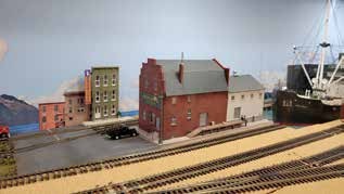 Glenn Runkewich brought us up to date with Grand River. Once again, he took liberties with the Walthers Columbia Feed Mill. He configured the building with the one long wall to the front. The loading dock cover made the building too wide, so the back wall, without a loading dock, is exposed. The back walls of the resultant building were omitted matching many of the Grand River structures. This Is the Gregory Fish Company. The building is illuminated wired in place utilizing wire nuts to hold the wiring and bulbs in place. The wiring is 20 gauge solid wire with providing enough stiffness to hold the light in position. As another anchor for the wiring Glenn uses a short piece of ¼ inch square tube that can be glued in place and the wire threaded through the opening to anchor the wire in position. Photos were added to the interior windows and with the lighting it brings the building to life.