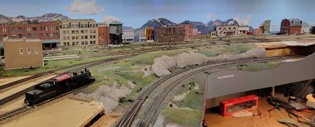 he background for the layout is added last. Glenn takes a photo of his layout scene and uploads it into photoshop. He can add in the background mountains and arrange the mountains as he likes. The photos are sized for the background and color matched to other background photos. The resulting background photos are printed on his printer and added to the layout.